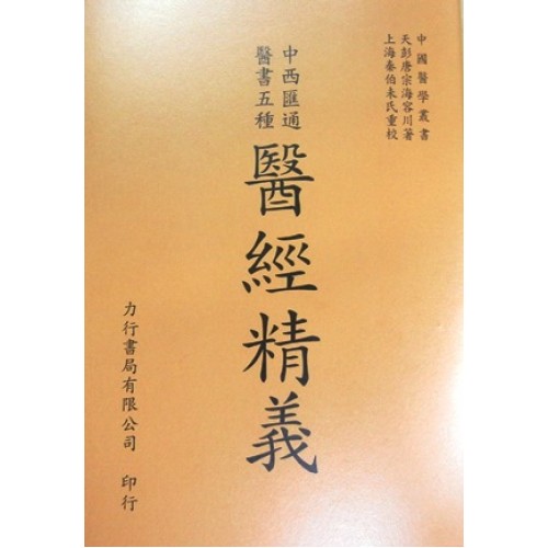 醫經精義-中西匯通醫書五種之一,唐宗海(榮川)編著,上海秦伯未氏重校,全書內文150頁,分為29類別,上卷1.人身陰陽,2.五臟所生,3.五臟所屬,4.五臟所藏,5.五臟所生,6.臟腑所合,7.臟腑之官,8.五臟九竅,9.男女天葵,10.血氣所生,11.營衛生會,12.六經六氣,13.經氣主治,14.十二經脈,15.衝任督帶,下卷16.全體總論,17.五臟所傷,18.五臟所惡,19.臟腑為病,20.諸病所屬,21.四時所病,22.臟腑通治,23.望形察色,24.聞聲別證,25.問察原委,26.診脈精要,27.審治處方,28.氣味陰陽,29.性味宜忌。